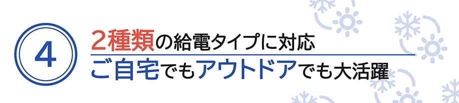 ●シガーソケット&AC電源2種類の給電タイプに対応、お宅でもアウトドアでも大活躍