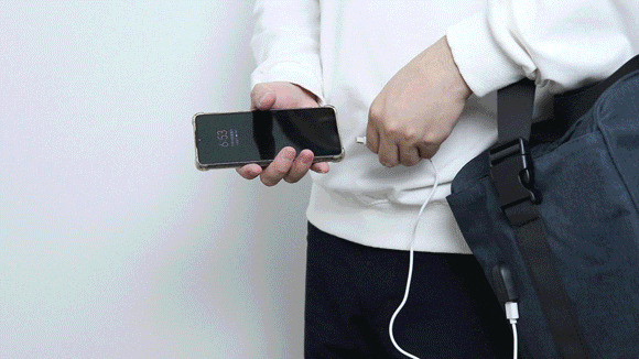 歩きながら持ち運ぶシーンも想定したため、モバイルバッテリーを入れれば、側面にあるUSB出力ポートからスマホへの充電が可能です。