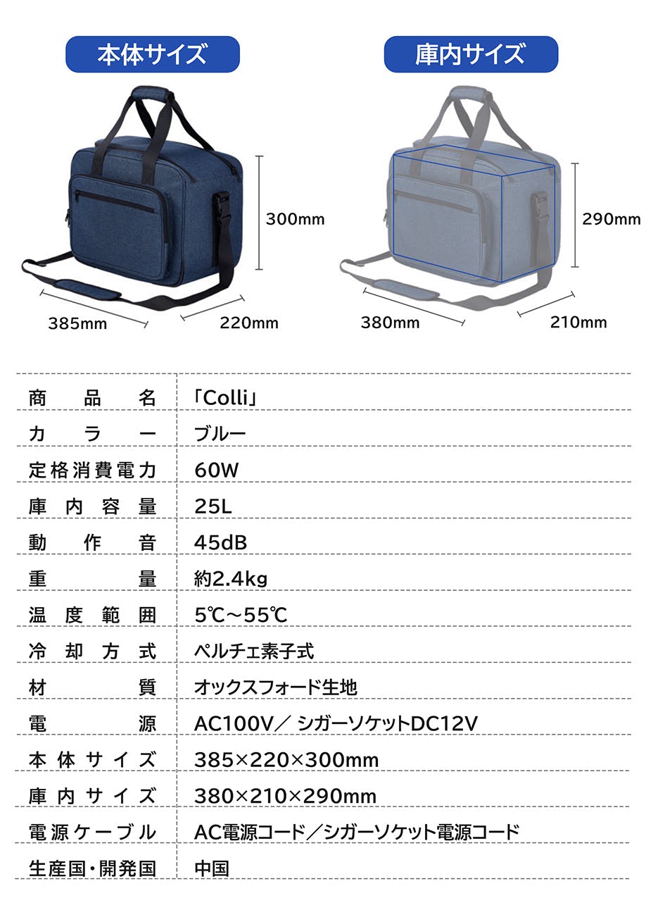 「Colli」は今まで重要視されなかったポータブル性に着目し、改良型のペルチェ素子冷却式を採用しています。従来型のユーザーから「冷凍機能より冷蔵機能の方が使うシーンが多い」、「冷蔵機能だけでもいいので、軽いものがほしい」などの声に基づき、冷蔵(冷却機能)と保温(放熱機能)を兼ねた、僅か2.4kgの「Colli」が誕生しました。