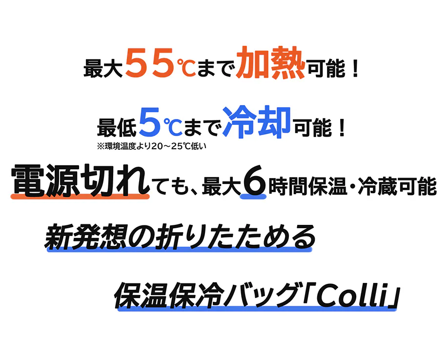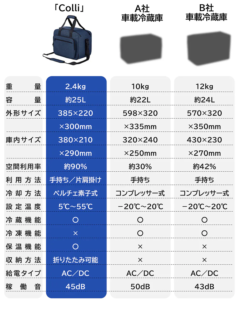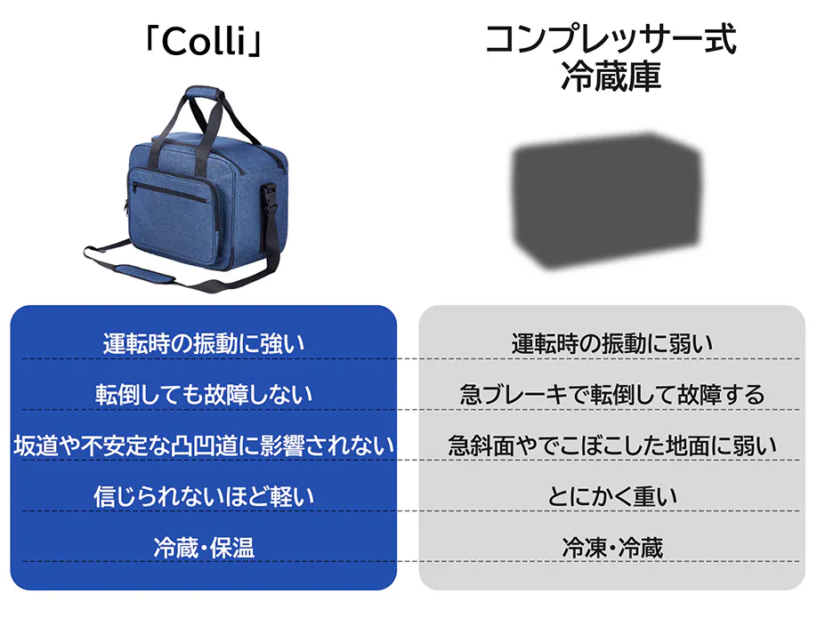 「Colli」は今まで重要視されなかったポータブル性に着目し、改良型のペルチェ素子冷却式を採用しています。従来型のユーザーから「冷凍機能より冷蔵機能の方が使うシーンが多い」、「冷蔵機能だけでもいいので、軽いものがほしい」などの声に基づき、冷蔵(冷却機能)と保温(放熱機能)を兼ねた、僅か2.4kgの「Colli」が誕生しました。