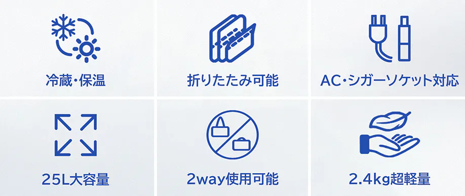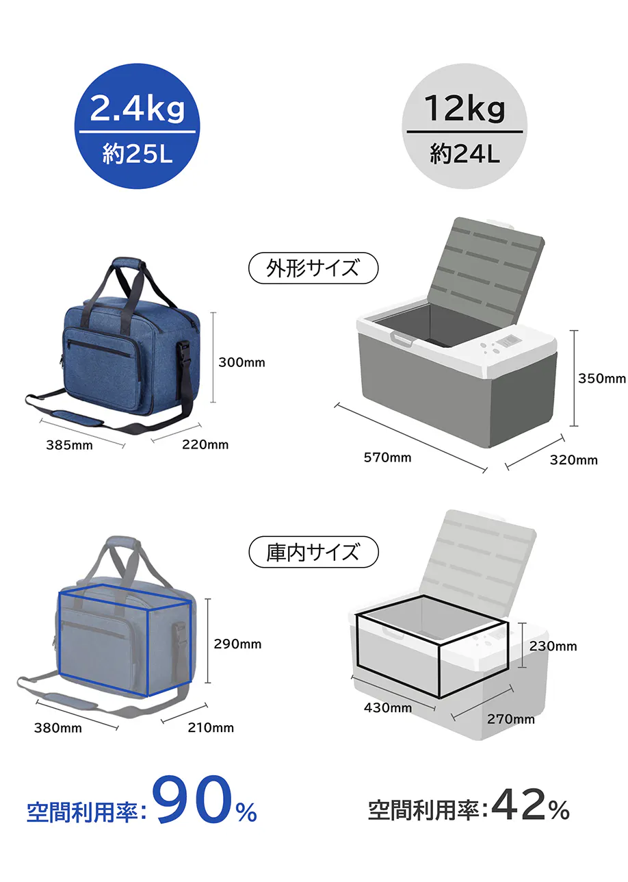 コンプレッサー式の従来品より空間利用率を驚異の90%までに拡大!コンプレッサー式の従来品より遥かに軽く、保冷剤や氷をたくさん入れるのが必要なクーラーボックスより便利で、アウトドアに欠かせないアイテムです。