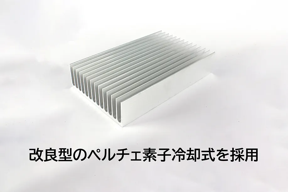 ペルチェ素子は半導体素子の一種で、通電するだけで急速に熱を吸収して、物を冷却させる効果があります。また、電流の向きを変えるだけで、加熱と冷却が切り替えられるのも特徴です。
