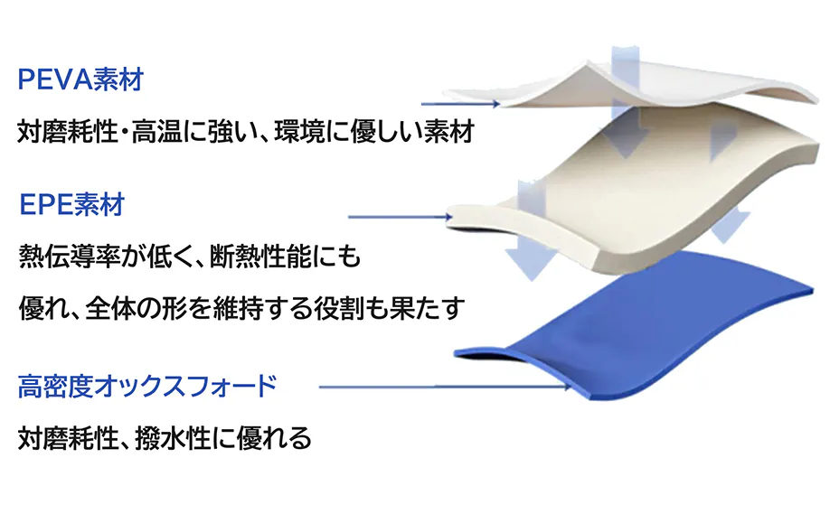 「Colli」のボディはPEVA素材、EPE素材と高密度オックスフォードの3層からなっています。断熱効果が優れた以外にも一定の柔軟性を持つため、従来型より衝撃と振動に強く、安心して持ち運べます。