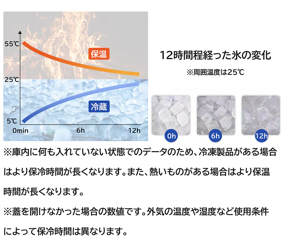 A:本製品は優れた断熱材を採用しているため、約6時間の保冷/保温が可能です。
