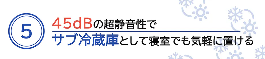 動作音がわずか45dBなのでキャンプ、ご自宅やオフィスのセカンド冷蔵庫として、置き場所を選ばずあらゆる場所で快適に使用できます。
