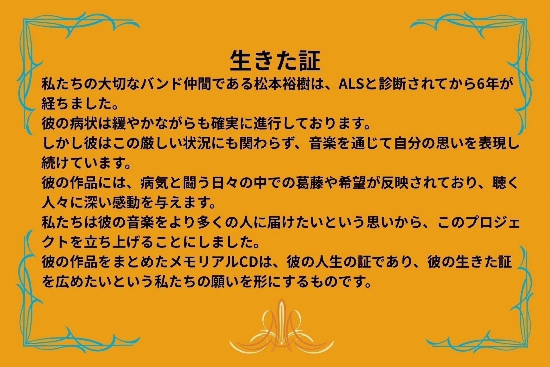 私たちの大切なバンド仲間である松本裕樹は、ALSと診断されてから6年が経ちました。彼はこの厳しい状況にも関わらず、音楽を通じて自分の思いを表現し続けています。彼の作品には、病気と闘う日々の中での葛藤や希望が反映されており、聴く人々に深い感動を与えます。私たちは彼の音楽をより多くの人に届けたいという思いから、このプロジェクトを立ち上げることにしました。彼の作品をまとめたメモリアルCDは、彼の人生の証であり、彼の生きた証を広めたいという私たちの願いを形にするものです。