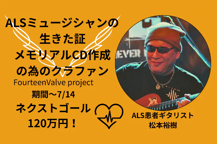 全国の皆様へ 島根県浜田市在住のALSギタリスト松本裕樹と申します。 自覚症状を覚えて7年、2019年11月の確定診断から6年目を迎えた筋萎縮性側索硬化症ALS患者です。 この度、私が在籍するBluesバンド「FourteenValve」のVocal伊藤勉氏が発起人となってくださり、多くのミュージシャン仲間とともに私の(おそらく人生最後の)音楽活動の集大成としてメモリアルCDを制作するというプロジェクトを立ち上げてくださいました。 そしてその資金集めの為、本クラウドファンディングに挑戦してくださいます。 本当に有り難いことです。 2019年、新潟県糸魚川市で生活していた私は、富山大学附属病院でのALS筋萎縮性側索硬化症の確定診断以降、2年間で徐々に四肢の運動機能低下と球麻痺の症状悪化が進み、それによって仕事、趣味の全て、ライフワークであるギタープレイ、そして家庭までをも失い、文字通り失意のどん底に叩き落とされました。 人生の最後を生まれ故郷の島根県浜田市で迎えたいと思った私は、2021年5月に単身でUターン致しました。 そして、その時の心情を弾けなくなっていたなりにもギターを爪弾きながら楽曲として残そうとしていた私のギターの音色を聴いた弟に励まされ、一からギターの練習と作曲に打ち込み始めました。 3年前の2022年には弟の協力のもと、全国の皆様のご支援を頂き5曲入りのオリジナルCDを制作販売させて頂きまして、その収益を神経性難病医療開発の最先端施設への寄付と、後に起きてしまった能登半島災害復興への義援金として寄付する活動を続けさせて頂いております。 ALS患者は殆どの患者が、残念ながら3年から5年程で呼吸困難に陥り、人工呼吸器を付ける(気管切開術=気切)か否かの選択を迫られます。 そして約7割の患者が気切を拒否して死に至ります。 ですから言葉は良くないかもしれませんが日本でのALS患者数の推移は、毎年患者がごっそり入れかわりながら、8,000人〜10,000人で横ばいとなっています。 私は確定診断から6年目を迎えていますが近頃では誤嚥、球麻痺(喋れない)、下肢の衰えが顕著となりました。 一所懸命に、それこそ寝る間を惜しんで努力した結果、今現在のレベルでならギターを演奏出来るようになりましたが、これもある日突然に手指が動かなくなるのだろうと覚悟はしています。 ですから、奇跡のALSギタリストとして音楽活動や能登半島災害復興のお手伝いが出来るのもそんなに長くはないと予想しております。 そんな中もう一度、私が後世に残せるものとして、人生の終盤まで続けてこられた音楽を、私自身のオリジナル楽曲たちを、2枚組のCDにして残したいと思うのです。 多くの音楽仲間に協力して頂きながら、尚且つ全国の皆様の応援のもと、私の思いが皆んなの思いともなってバラエティに富んだ音楽作品に昇華することを心から願っております。 ALSギタリスト 松本裕樹