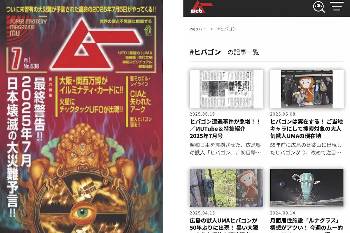 月刊ムー、webムーでもヒバゴンの記事は数多く取り上げられています