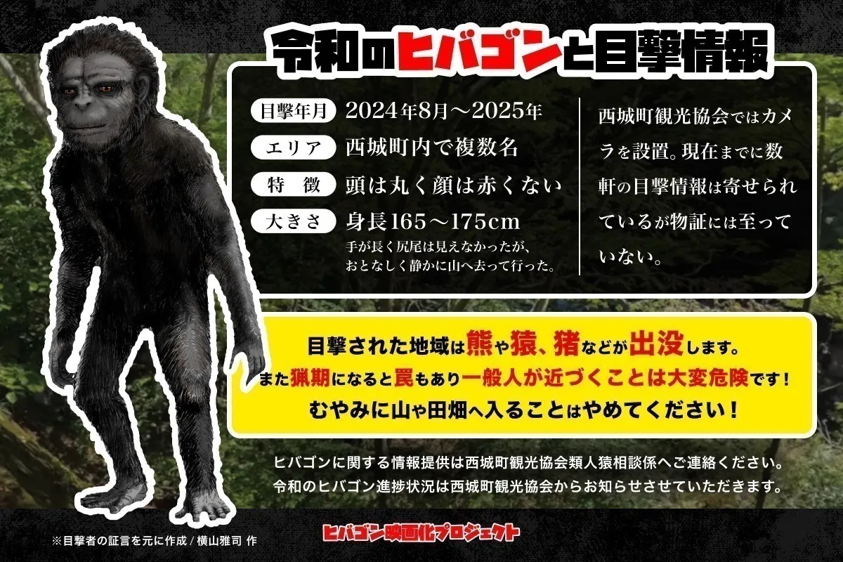 ヒバゴン劇場映画化プロジェクト!広島県庄原市西城町で語り継がれる未確認生物「ヒバゴン」。今年、目撃から55周年を迎えるこの伝説を映画として形にし、町の魅力を発信したいと考えています。来年春、オール庄原市西城町ロケでの撮影を目指し、地域の元気と関係人口の増加に繋がる作品づくりを進めています。