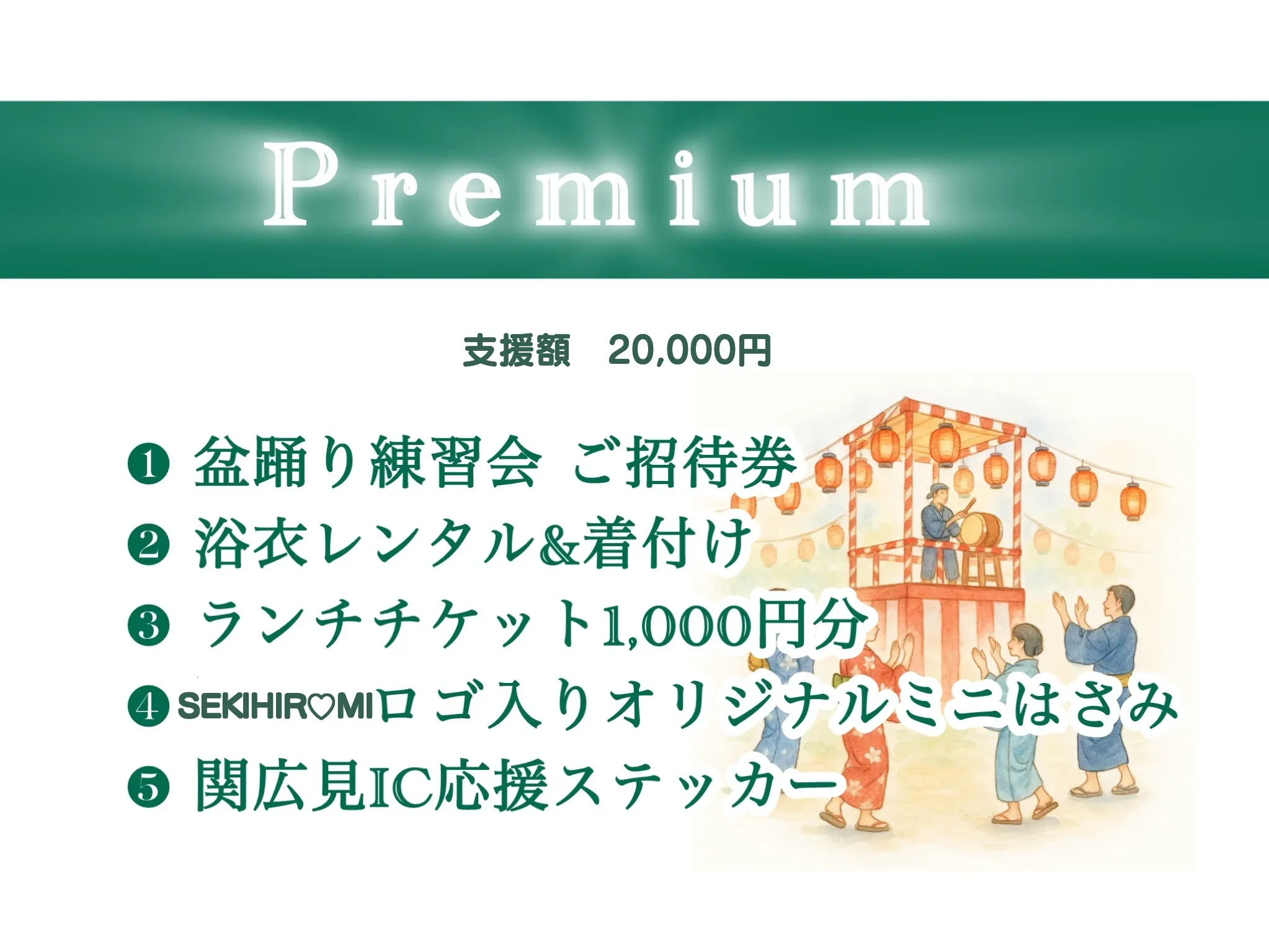 Premiumパック(20,000円) 関広見まつりサテライト会場 応援盆踊り練習会の招待券 + 浴衣レンタル(着付け付き) 6,500円 + 関市ご当地グルメランチチケット 1,000円分 + SEKIHIR♡MIロゴ入りオリジナル限定ハサミ 1,100円 + 関広見IC応援ステッカー 500円