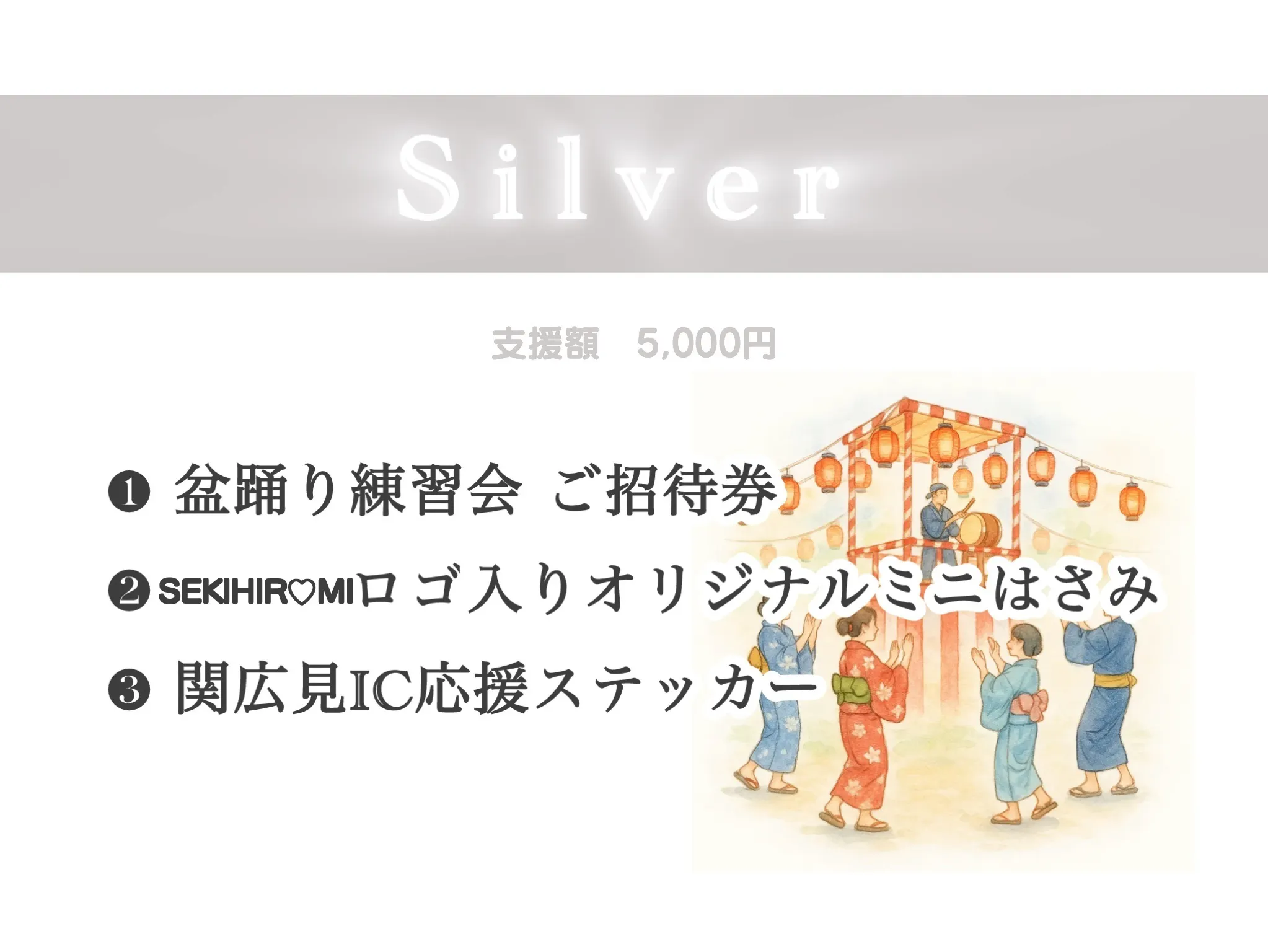SILVERパック(5,000円) 関広見まつりサテライト会場 応援盆踊り練習会の招待券 + SEKIHIR♡MIロゴ入りオリジナル限定ハサミ 1,100円 + 関広見IC応援ステッカー 500円
