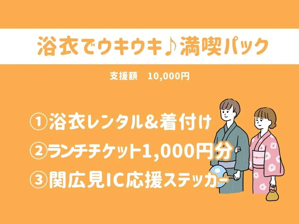 浴衣でウキウキ♪満喫パック(10,000円) 浴衣レンタル(着付け付き) 6,500円 + 関市ご当地グルメランチチケット 1,000円分 + 関広見IC応援ステッカー 500円