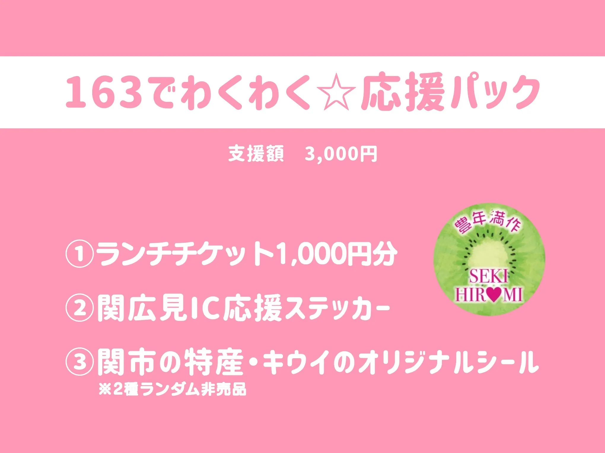 163でわくわく☆応援パック(3,000円) ランチチケット1,000円分 + 関広見IC応援ステッカー 500円 + 関市の特産・キウイのオリジナルシール 非売品