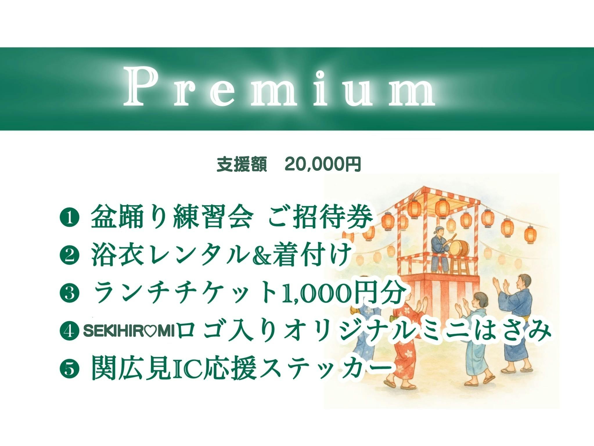 Premiumパック(20,000円) 関広見まつりサテライト会場 応援盆踊り練習会の招待券 + 浴衣レンタル(着付け付き) 6,500円 + 関市ご当地グルメランチチケット 1,000円分 + SEKIHIR♡MIロゴ入りオリジナル限定ハサミ 1,100円 + 関広見IC応援ステッカー 500円