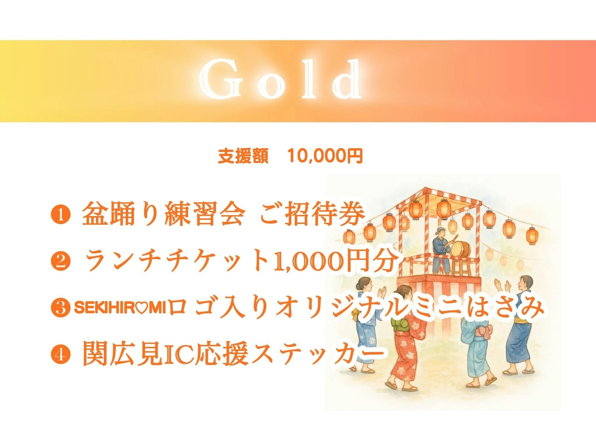 GOLDパック(10,000円) 関広見まつりサテライト会場 応援盆踊り練習会の招待券 + 関市ご当地グルメランチチケット 1,000円分 + SEKIHIR♡MIロゴ入りオリジナル限定ハサミ 1,100円 + 関広見IC応援ステッカー 500円