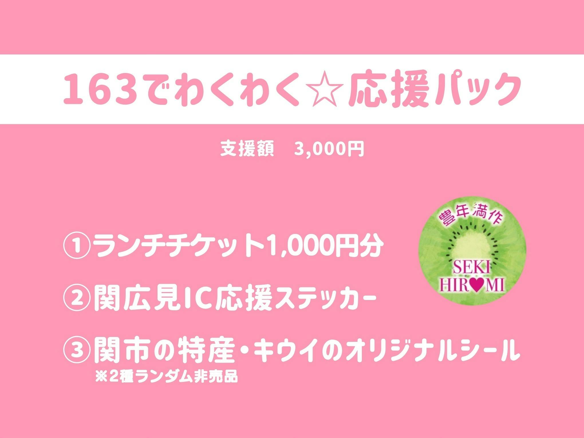 163でわくわく☆応援パック(3,000円) ランチチケット1,000円分 + 関広見IC応援ステッカー 500円 + 関市の特産・キウイのオリジナルシール 非売品