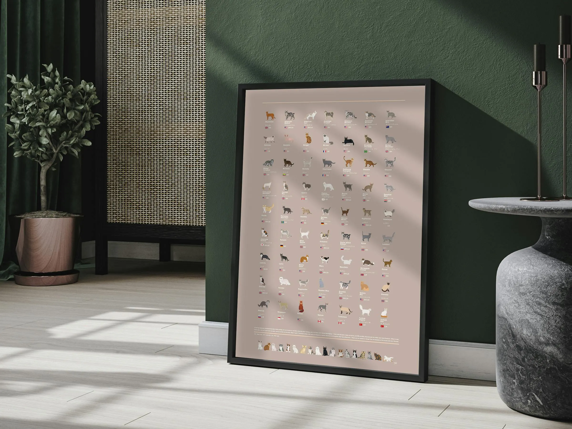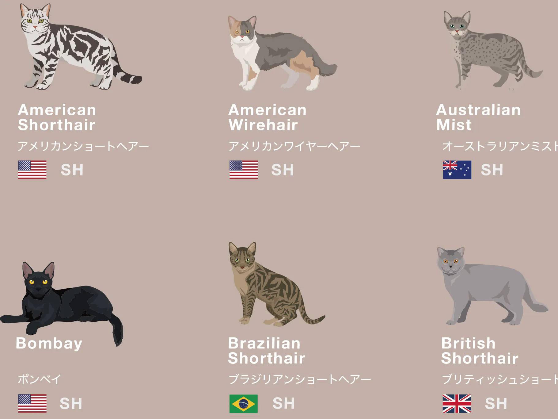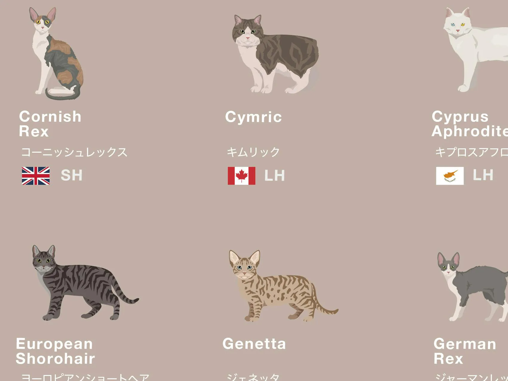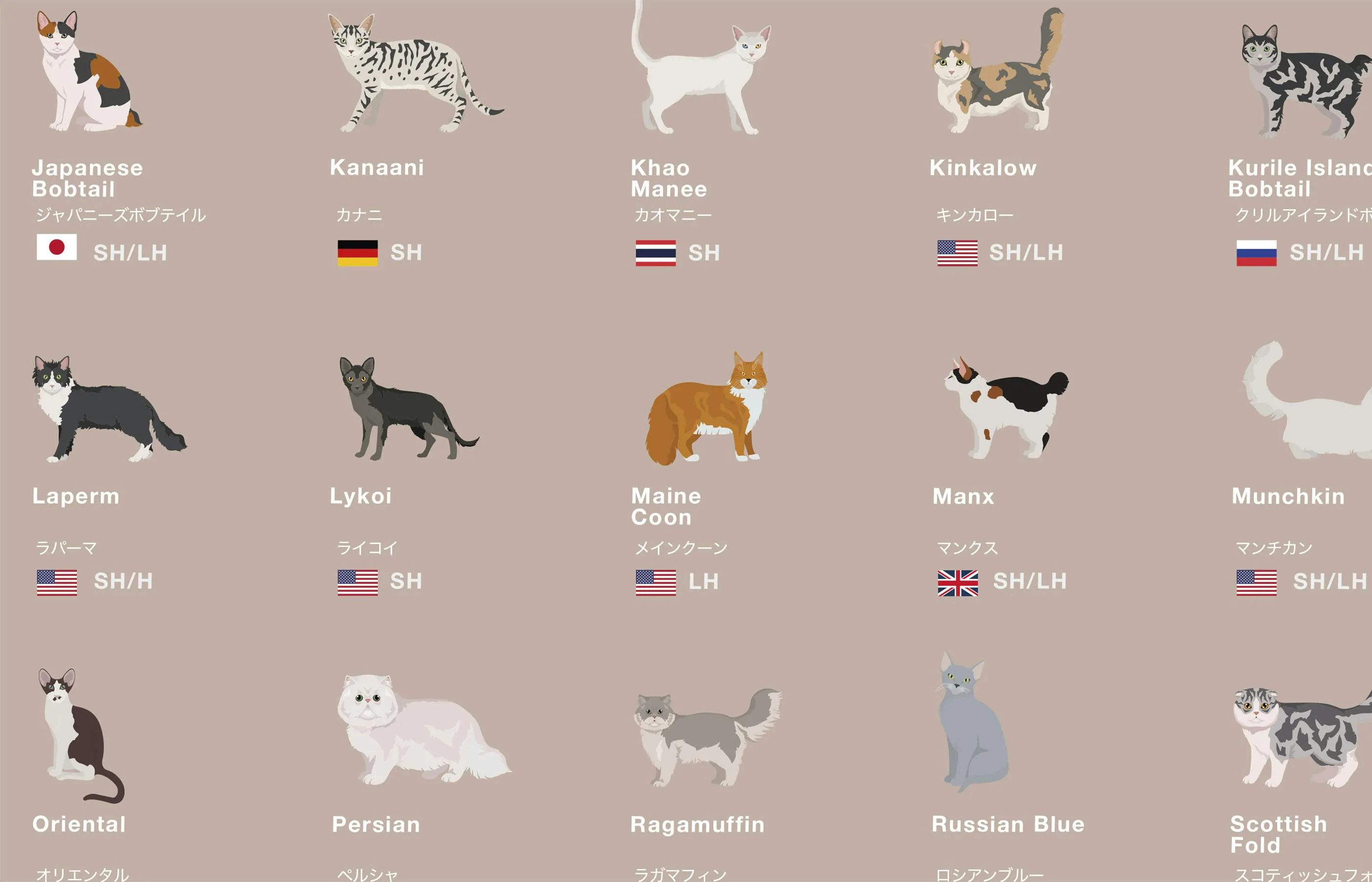* 猫の掲載基準については、世界各国の猫に関する協会や団体の情報を参考に、多くの人が見て楽しめる多様性を主に重要視し、7e8デザインにて独自に選択をしています。