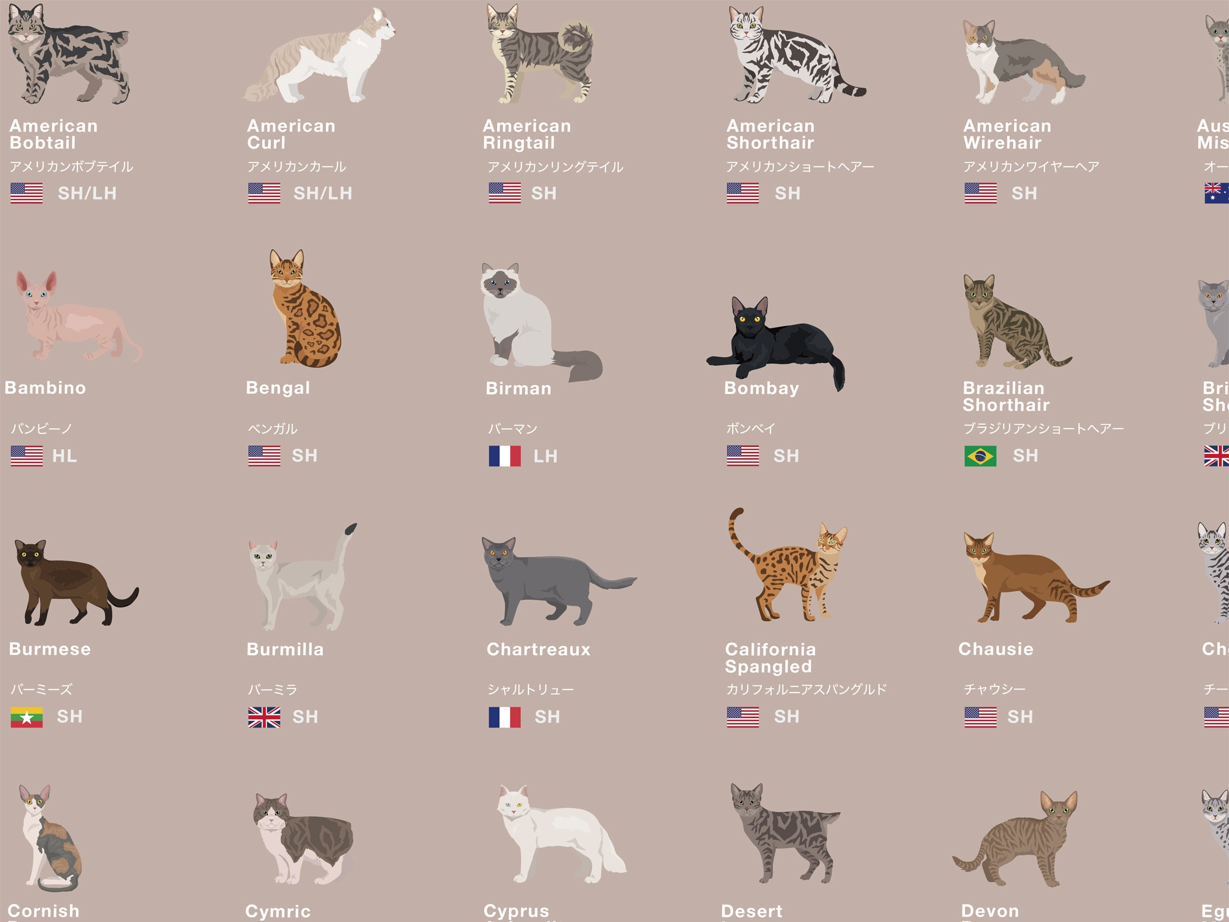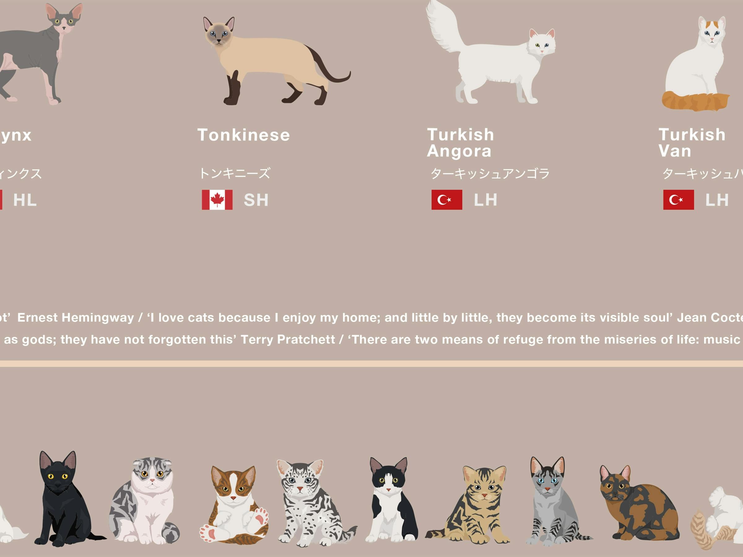 * 猫の掲載基準については、世界各国の猫に関する協会や団体の情報を参考に、多くの人が見て楽しめる多様性を主に重要視し、7e8デザインにて独自に選択をしています。
