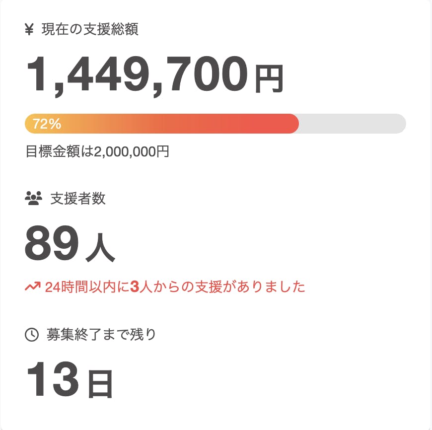 72%ということで達成まで残り50万円ちょっと、ということになります…