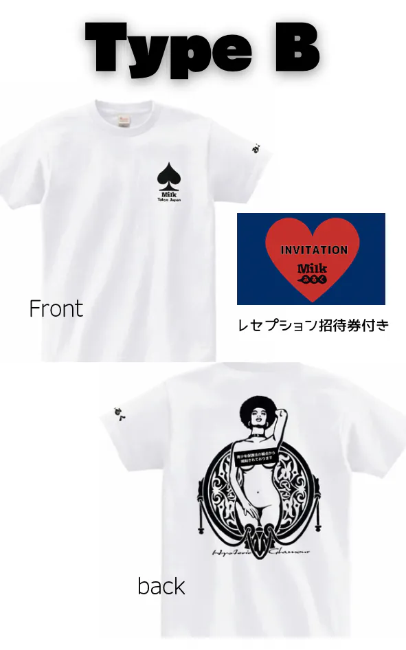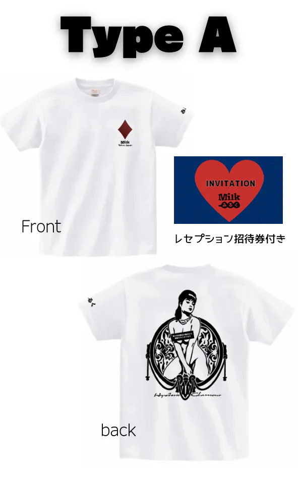 当時のスタッフTシャツである、みるくとHYSTERIC GLAMOURとのコラボTシャツ復刻版や(仮)恵比寿みるく展のレセプションイベントの招待券など。