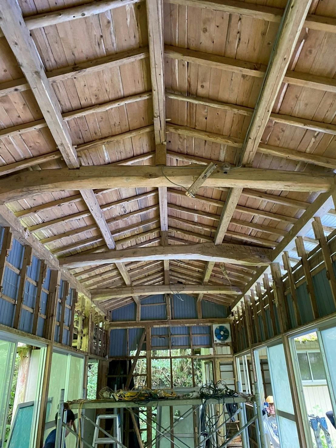 解体後は、天井の下地の板がとれ、力強い梁が出てきており、なんとも言えない達成感を得ることができました!