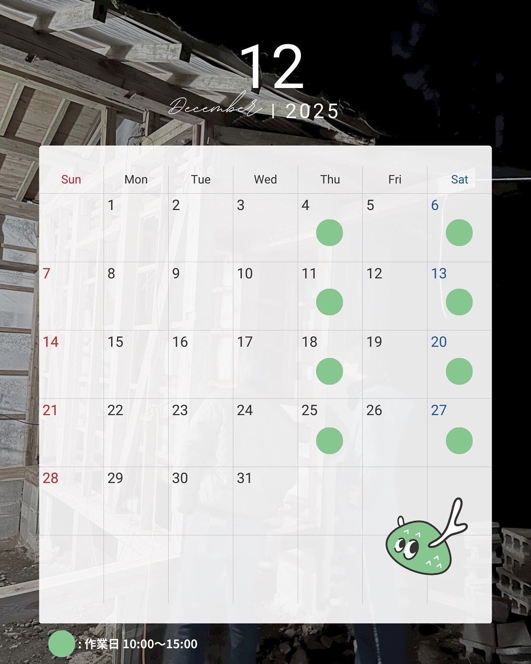 12月の施工日のお知らせです。このカレンダーの日程に沿って施工を行う予定です!興味のある方はぜひ、見学にいらしてください!!