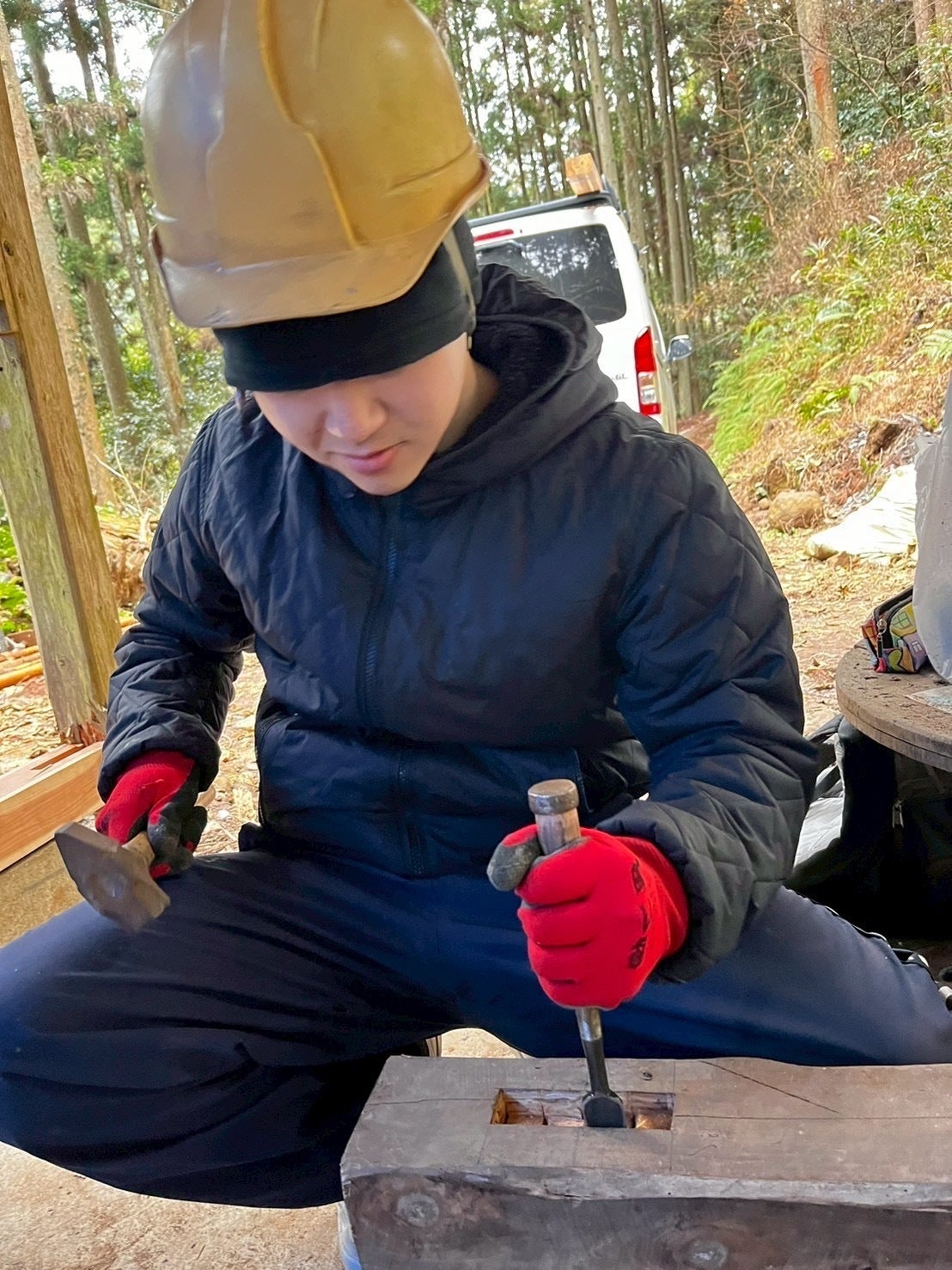 こちらは木材の加工です!もうお馴染みになってきたでしょうか。今回の加工では新しく入るほぞ穴を彫っています。完成した時どこに使われるのか楽しみです!