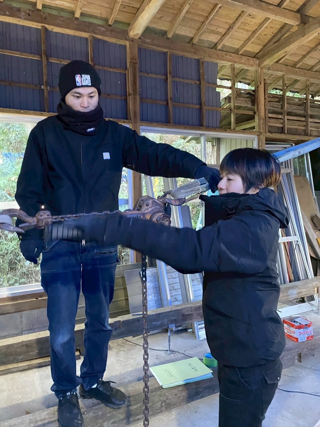 こちらは傾いたり、歪んだりした柱を引っ張って垂直に矯正する作業です!