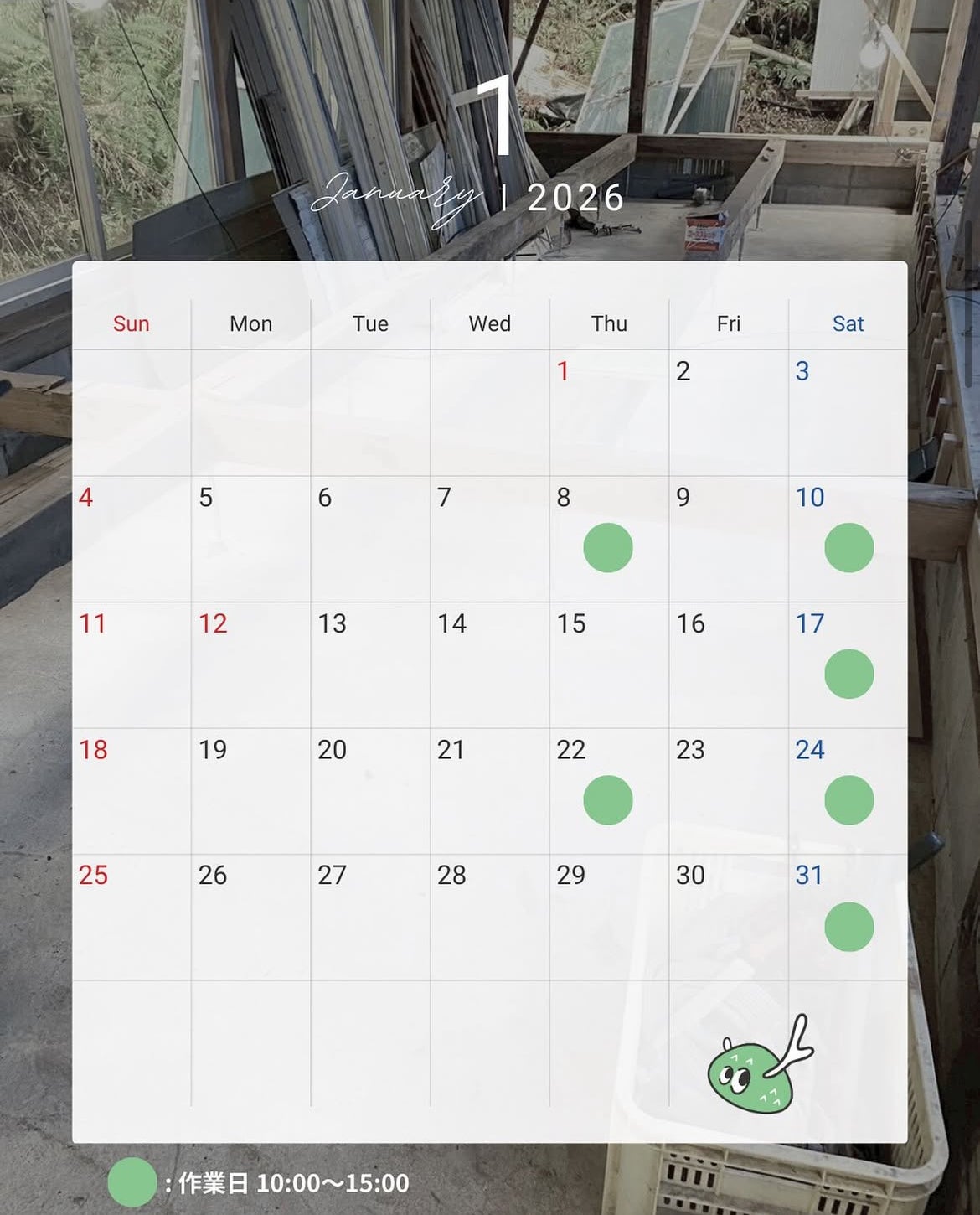 こちらは今月の作業日程です!是非、見学にいらしてください!お待ちしております!
