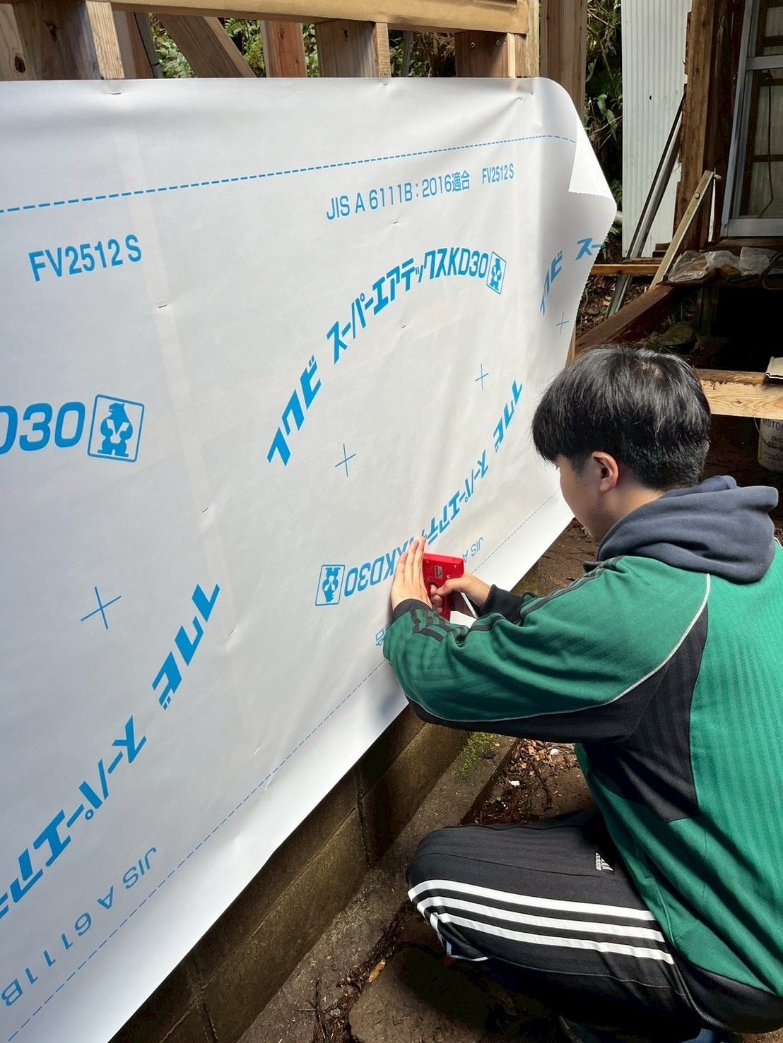 こちらは防水シートを貼っている様子です。 壁の完成に向けて着々と作業が進み、空き家が目の前で生まれ変わるのを見て、とても嬉しい気持ちになります!