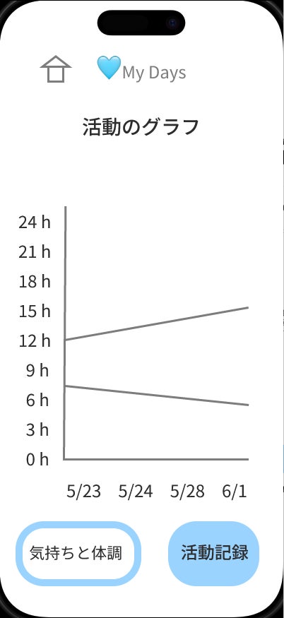感情や体調の波と一緒に、「その日にどれくらい動けたか(運動・家事・外出など)」を主観・客観の両方から記録し、お互いに共有する。