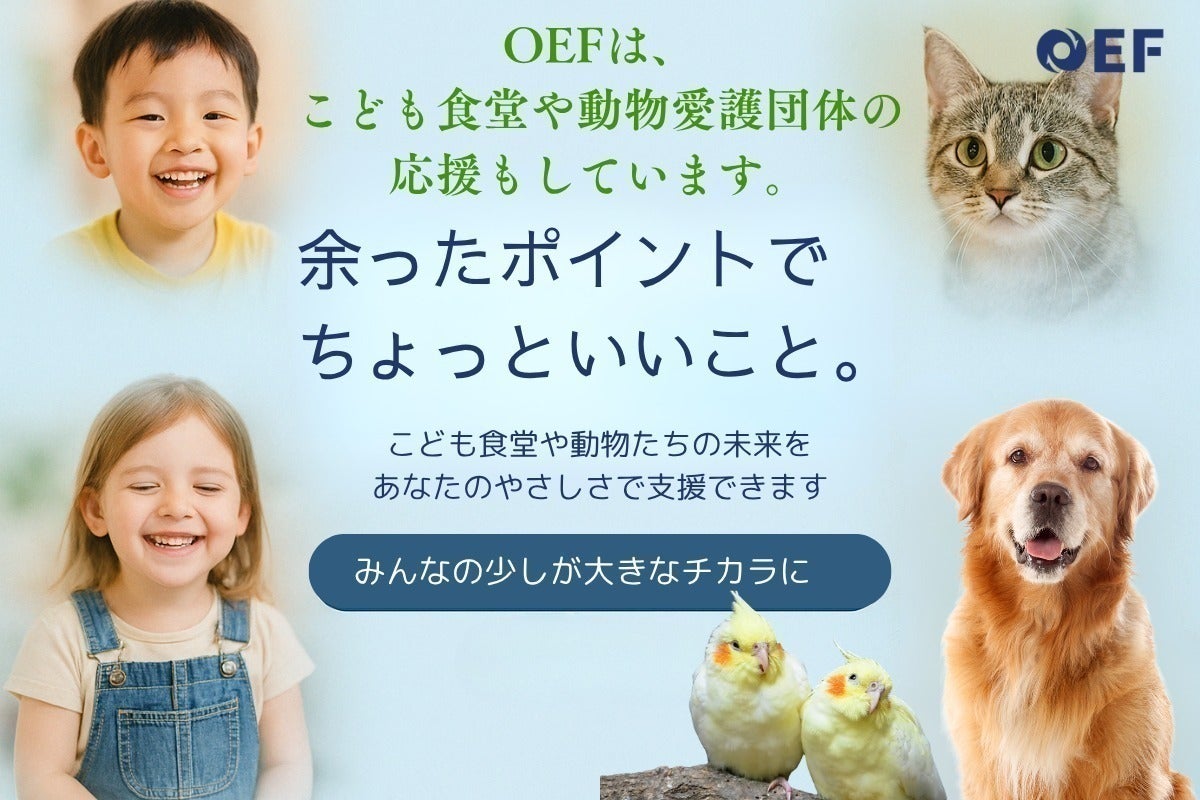 OEFでは、非営利のNPO団体、子ども食堂、動物保護団体など、社会貢献活動を行う慈善団体を応援しています。エシカル会員は、OEFに登録された団体へポイントで応援することができます。