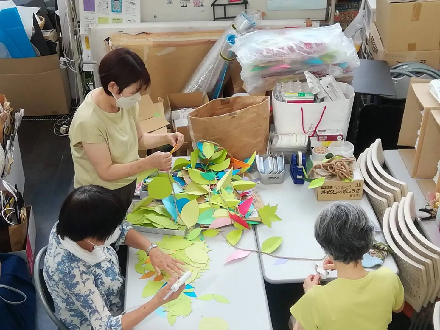 こちらは「ねこの手会」(=市民館サポーターさんや通りかかった人がお喋りしながら作業をお手伝いしてくれる会!)の皆さんが、会場装飾用の手作りのツタを作っている様子です。