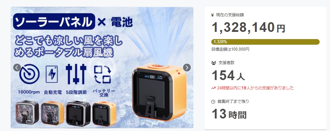 • 皆さま、おはようございます。このたびは、【電力を選ばない頼れる風力。交換式バッテリー&ソーラー充電対応のポータブル扇風機】プロジェクトにご賛同・ご支援いただき、誠にありがとうございます。6月23日より公開となった本プロジェクトですが、終了まで残り13時間となりました。皆さまがたくさんのSNSへのシェア、知り合いの方へのお声がけをしていただけたからこそ、この結果をいただくことが出来たと思います。最後まで気を抜かずに頑張っていきますのでご応援及び拡散を宜しくお願い致します。 もっと見る