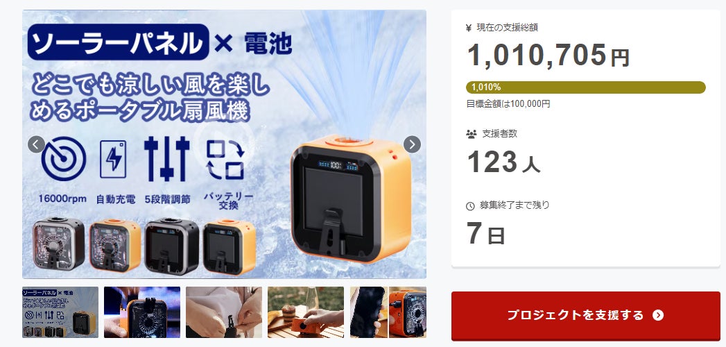 皆さま、おはようございます。この度は「電力を選ばない頼れる風力。交換式バッテリー&ソーラー充電対応のポータブル扇風機」にご支援頂き誠にありがとうございます!皆様の温かいご応援のおかげで、支援総額が100万円を超えました。弊社スタッフとメーカー一同、心から感謝しております。よかったら、SNSでのシェア・拡散をお願い致します。