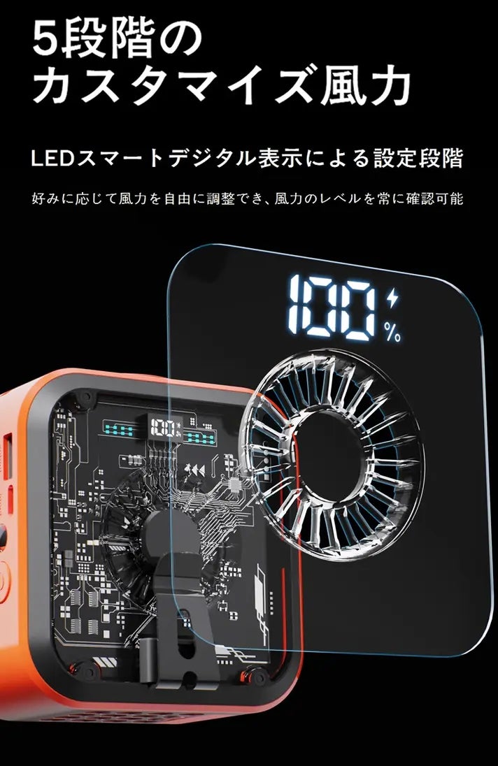 交換式バッテリーと太陽光充電に対応した10,000mAhの大容量ポータブルファン。スマホ充電やライト機能も備え、5段階の風量調節と毎分16,000回転の高性能モーターで広範囲に強力送風。首掛け・腰装着・卓上の3WAY仕様で、屋外でもハンズフリーで快適に使える多機能モデルです。