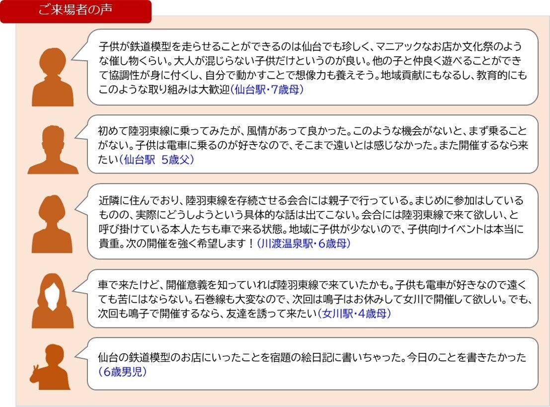 仙台から電車でお越しいただくご家族もあり、地域の子育て支援と鉄道活性化を目指した取り組みとして、17組のご家族にご参加いただきました。地域の子どもたちに楽しんでもらえただけでなく、街にもささやかな賑わいが感じられ、今後、どうすれば電車に乗ってもらえるのかを考える上での一つのヒントにもなったのではないかと感じています。