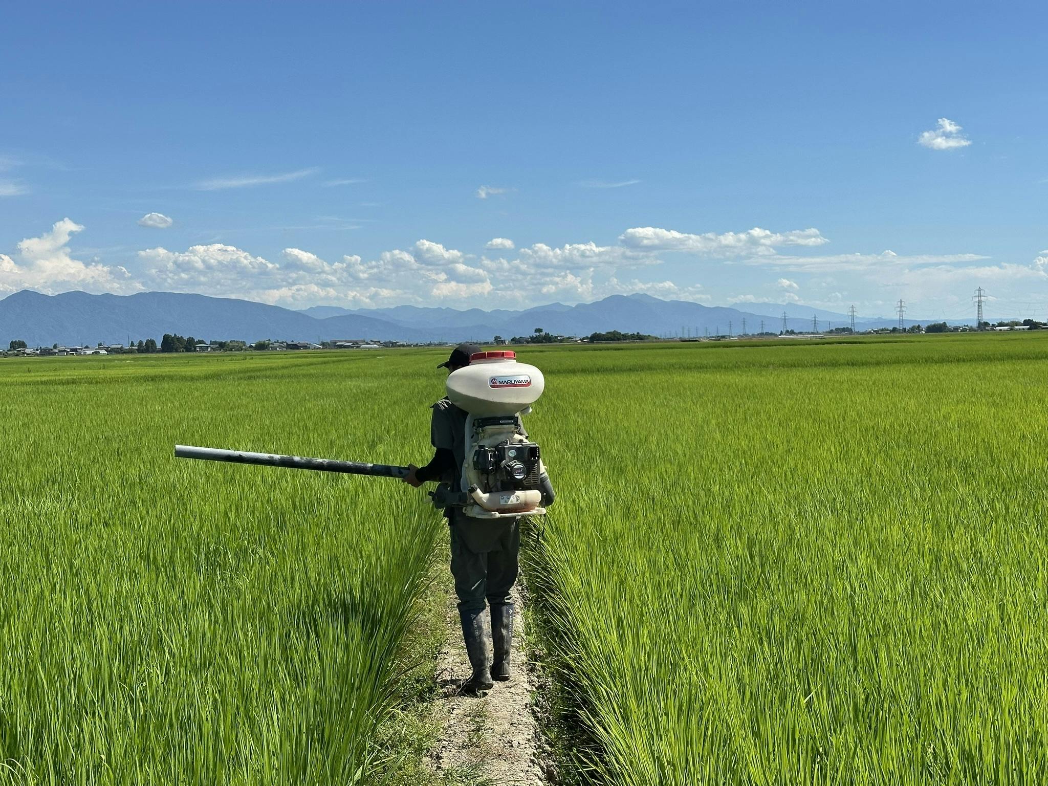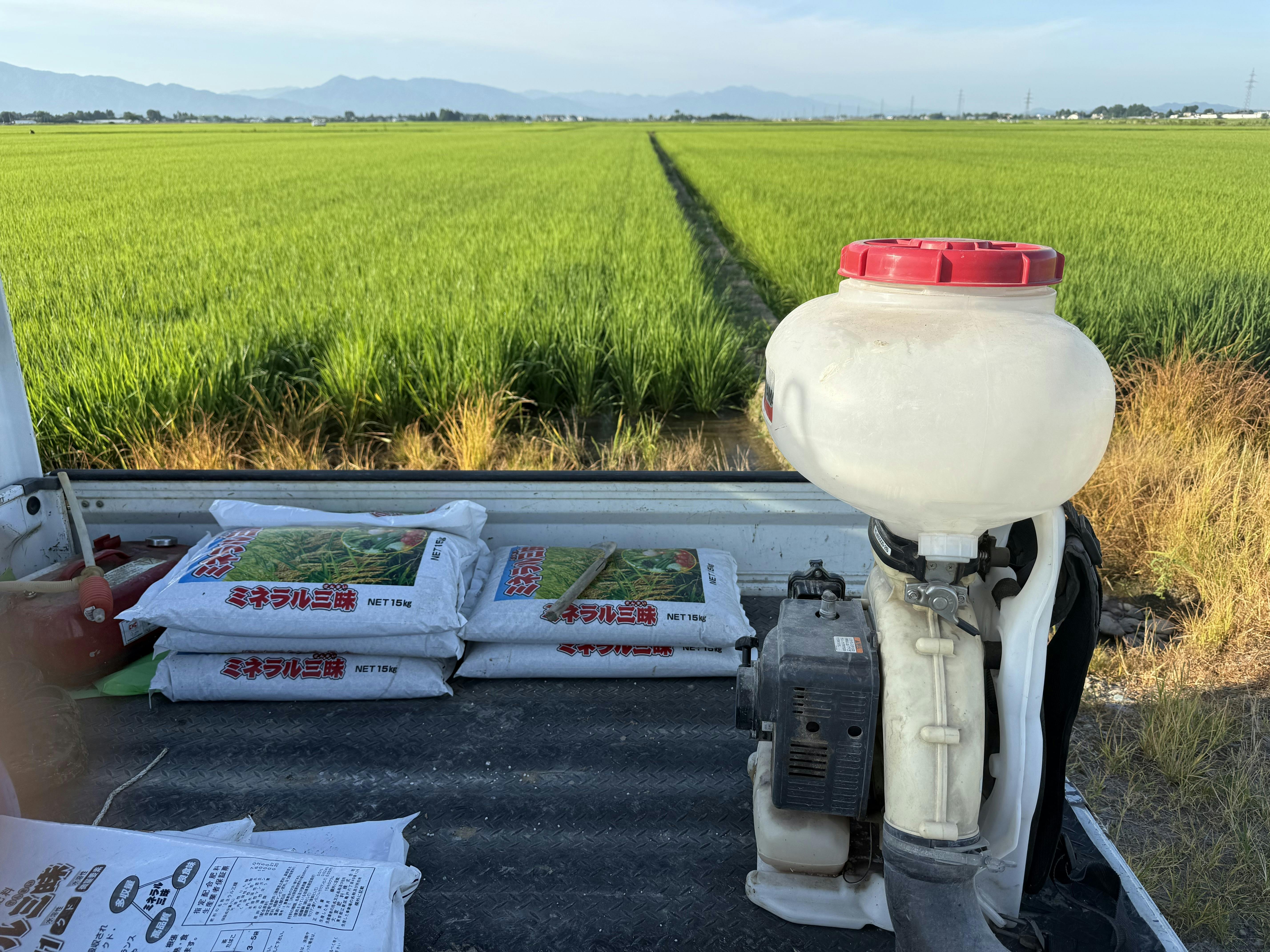 暑い日が続くと、稲も生き延びるために栄養不足になります。そのままだと、お米にもよくありません。そのため追加で肥料を撒く必要があります。田んぼの状況にもよりますが、有機肥料を使用して減減栽培をしています。20㎏の肥料を担いで田んぼを回るため、体力勝負です!子どもたちや、支援くださった方へおいしいお米を届けるために頑張ります!!