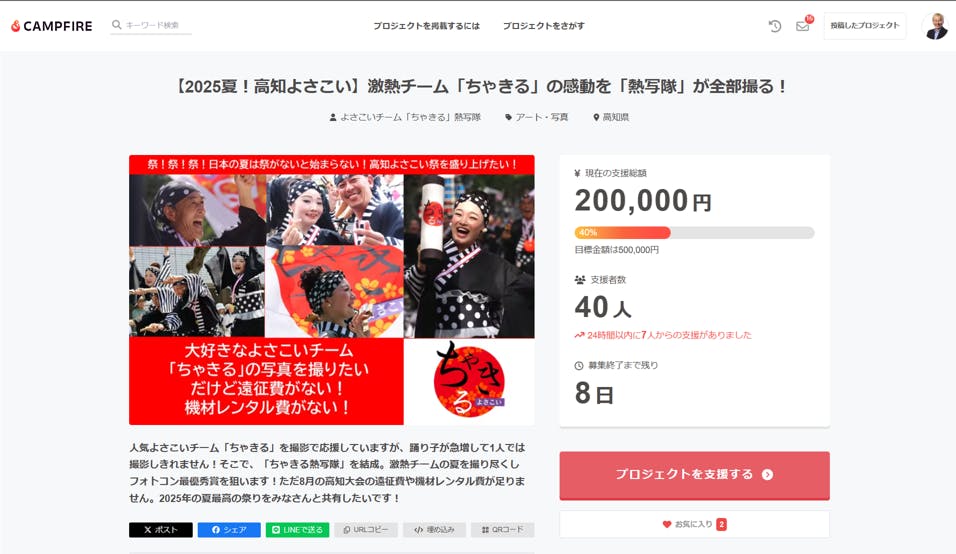 ご支援いただいた皆さま!本当にありがとうございます!おかげさまで、7月30日午前10時過ぎ、支援総額が20万円(40%)に達しました!終了まであと8日!高知の夏空のもと、応援するよさこいチーム「ちゃきる」を熱写できるよう、さらに多くの方々のご支援実現に向けて活動していきます!いっそうのご支援、拡散をお願いいたします!