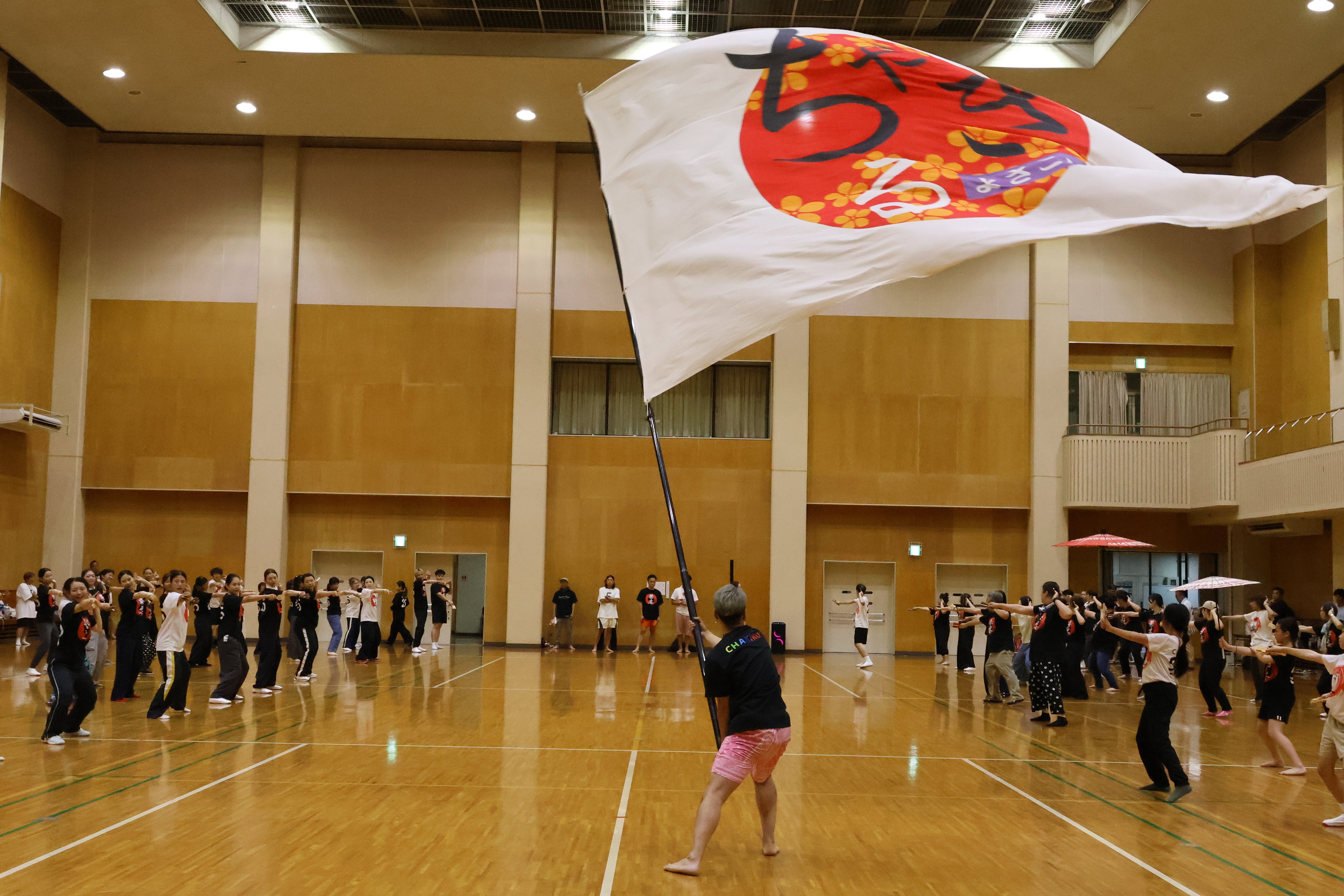 今回のよさこいは、当初から天候が心配されていましたが、到着した8月8日は蒸し暑いながら雨は降らず。「今降ってもいいから、祭り本番はなんとかもってほしいなぁ…」と祈るような気持ちでした。この日は屋内の施設で最終リハーサル。踊り子さんは衣装ではなくチームのオフィシャルTシャツを着ての全体練習で、かえって新鮮でした。