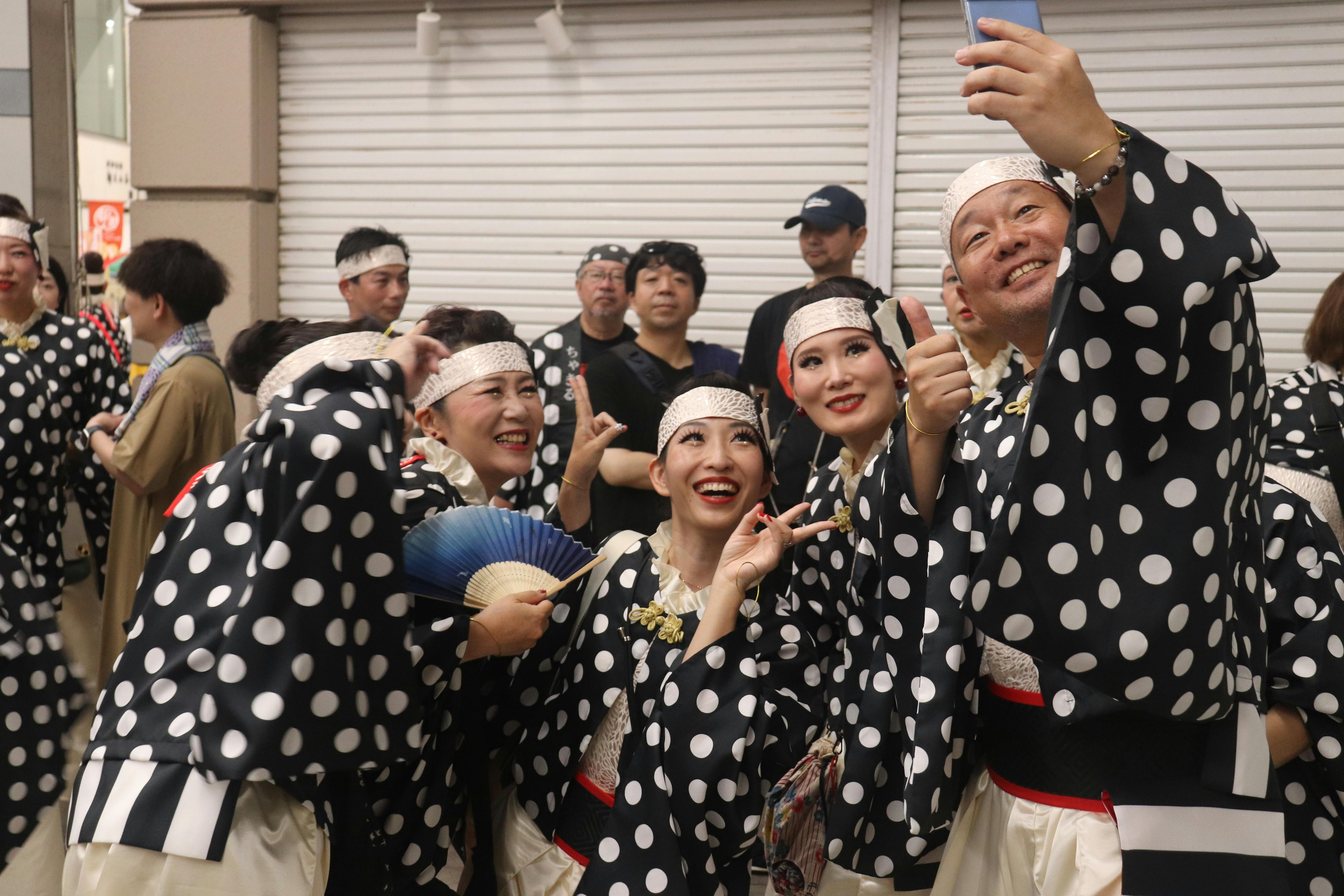 明けて前夜祭。街はいっきに祭りムードになります。この日は夜に中央公園ステージでお披露目の演舞があるのみ。ちゃきるは夕方に高知大丸デパート横に集合。踊り子さんは待ち時間の間、思い思いにおしゃべりしたりスマホで記念写真を撮ったりお化粧を仕上げたり。お店の大きなガラス窓を鏡代わりに、踊りの最終確認に余念がない踊り子さんも。出番に向けて徐々に緊張と興奮が高まる時間です。熱写隊も肩慣らしでスナップ撮影を開始。順番を待って、照明に照らし出された大きなステージで、大勢の観客に向かって今年のちゃきるの演舞を披露しました。