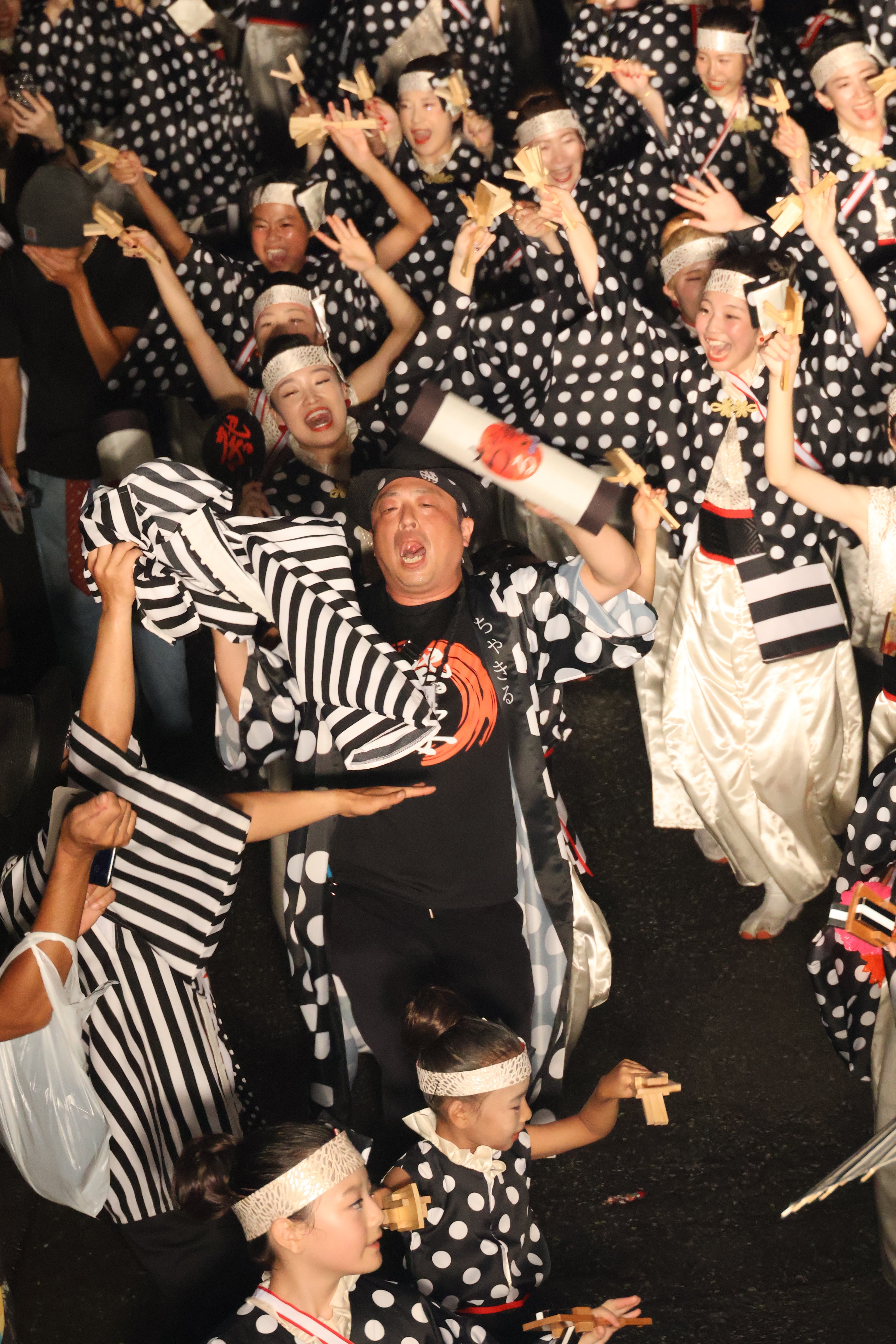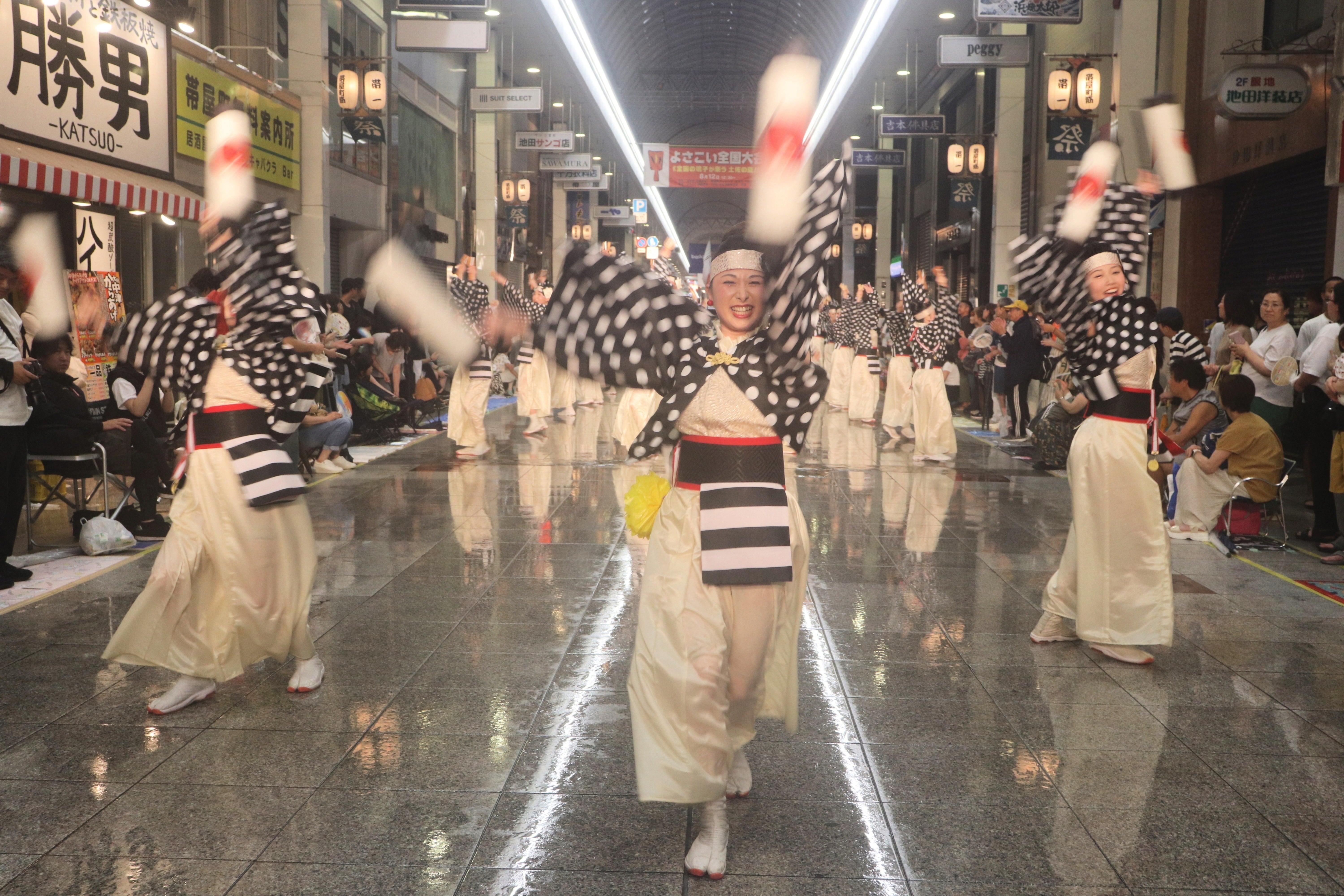 今回ちゃきるは、受賞チームだけが踊れる後夜祭には出場できず、本祭2日間で演舞を終えました。演舞は、狭く曲がりくねった飲食店街である「柳町」での演舞でした。これまでの「魅せる演舞」と違い、この柳町では踊り子自身が「はじける演舞」をして、他の場所とは異なる盛り上がりを見せます。踊り子だれもがよさこいの聖地である高知で踊る喜びをはじけさせ、沿道の見ている人たちと一体になって盛り上がります。