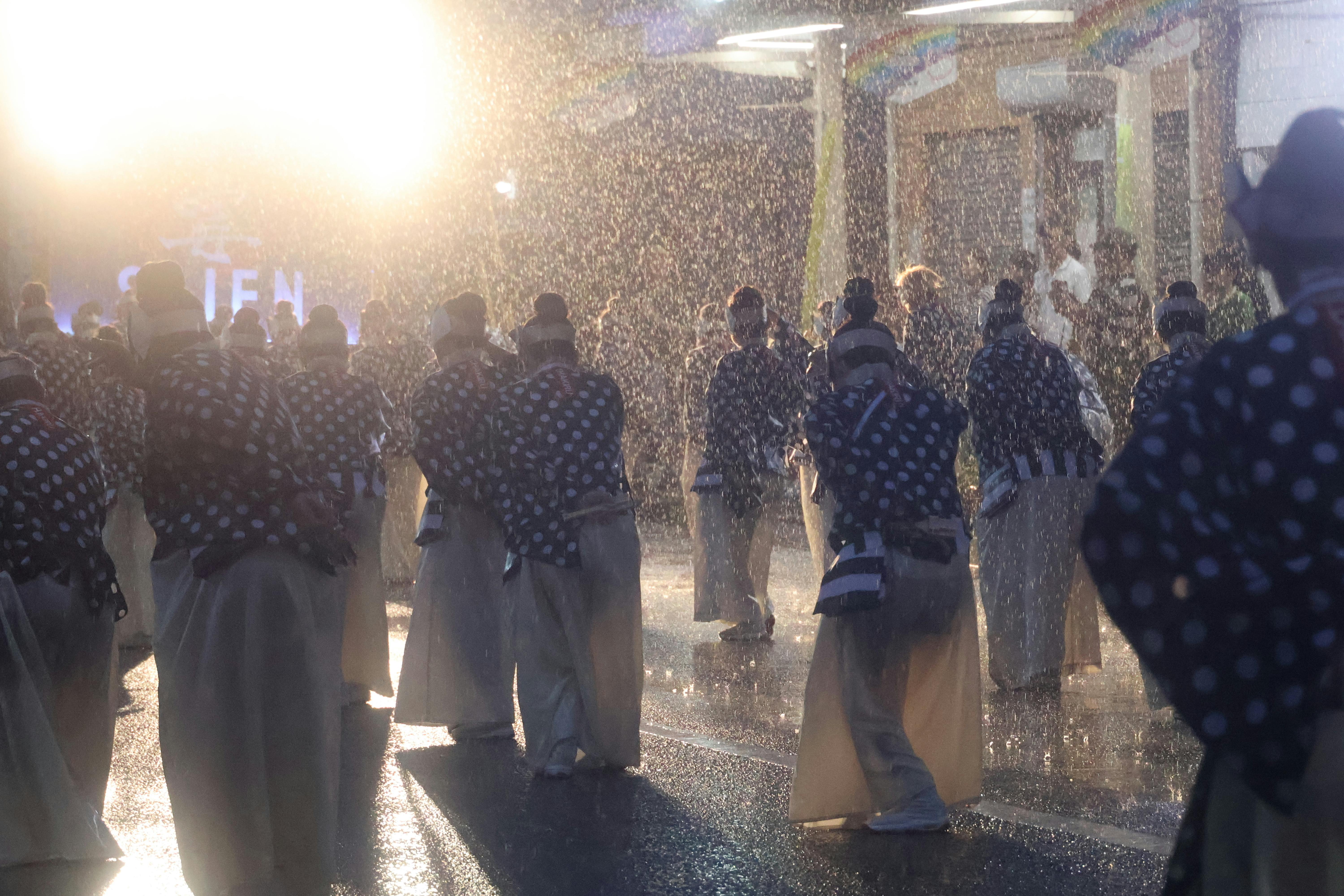 この日、時々土砂降りに見舞われながら、愛宕(あたご)→万々(まま)→上町(かみまち)→升形(ますがた)→菜園場(さえんば)→大手筋・南(おおてすじみなみ)→帯屋町(おびやまち)で演舞しました。よさこいはこうしてあちこちの商店街で、応援してくださる沿道のみなさんと一体になってボルテージを上げていくのが特徴のお祭りです。演舞場によってはステージで踊ることもありますが、基本はそれぞれのチームの地方車(じかたしゃ=各チームそれぞれ工夫を凝らした飾りつけをしたトラック。その上に乗って「あおり」が踊り子さんにハッパをかける)を先頭に、隊列を組んで進みながら踊る「流し」です。踊り子さんは、雨の中でも元気いっぱい笑顔いっぱいで踊ります。演舞のあとは、必ず給水所の冷たい麦茶で水分補給。私たち撮影スタッフも麦茶をいただきますが、これが冷たくておいしい!