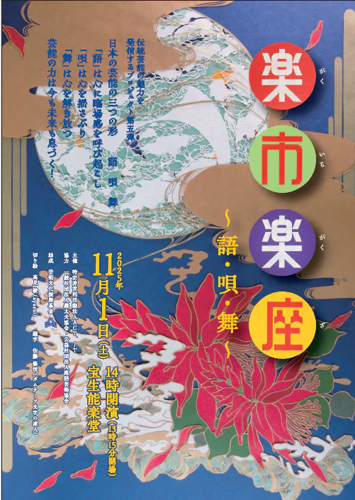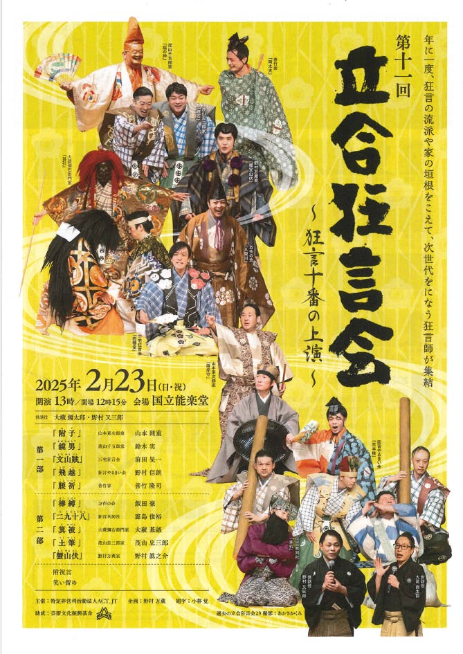 - また、流派家の垣根をこえて狂言の全家の若手狂言師が集結する「立合狂言会」、伝統音楽がジャンルをこえて一堂に会する「楽市楽座」等様々な形式での公演開催により、日本の伝統芸能の楽しさを伝える活動を行っています。