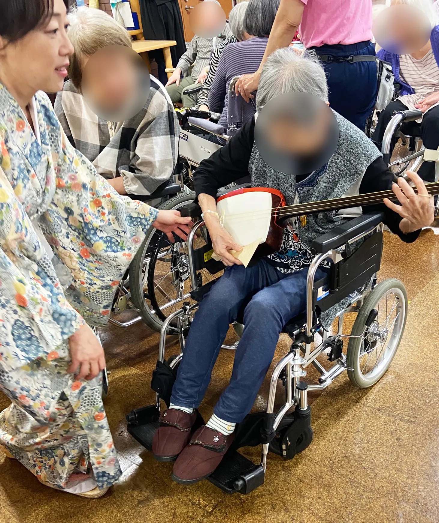 別の施設での話です。車いすに乗り、喜怒哀楽をあまり示さなくなったご婦人がいました。かつて三味線を弾いていたとスタッフから聞き、楽器体験の際に三味線を手渡しました。 彼女は三味線を両腕で抱え、目を遠くへ向けながら頭で拍子を刻む姿が見られました。その姿には、若かりし頃の彼女が三味線を弾いていた記憶が重なって見えました。
