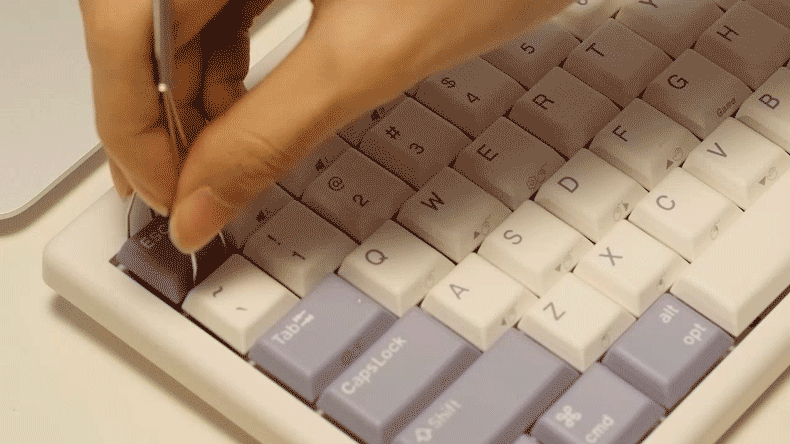 付属の引抜工具を使えば、キーキャップを簡単に取り外すことができます。掃除の際や、MacとWindowsの間での切り替え時、また自分好みにカスタマイズしたキーキャップを使用する際にも便利です。