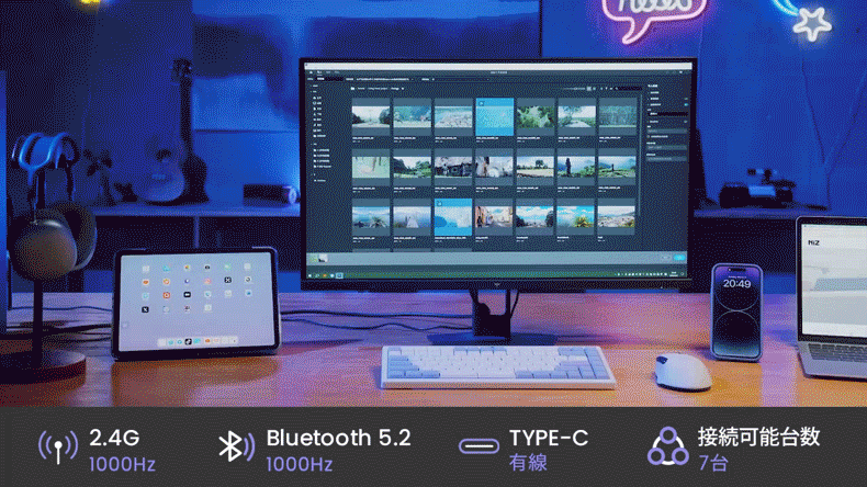 ワイヤレス接続時には、スマホ、タブレット、パソコンなど異なるデバイス間でスムーズな切り替えが可能です。自宅、外出先、オフィス、シーンに合わせた最適な接続方法で、より一層作業がはかどります。