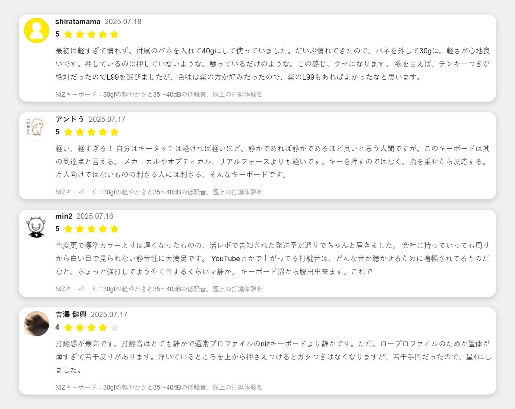 2025/07/30 17:12支援者の皆様こんにちは。NIZキーボード運営チームです。この度は、弊社の新製品をご支援いただき、誠にありがとうございます。今回は、実際にご使用いただいた方のご感想をぜひご参考ください。私たちは、心を込めて多くの調査を行い、本製品の研究・改良・生産に取り組んでまいりました。ぜひ引き続き、本プロジェクトへのご支援をよろしくお願い申し上げます。 もっと見る