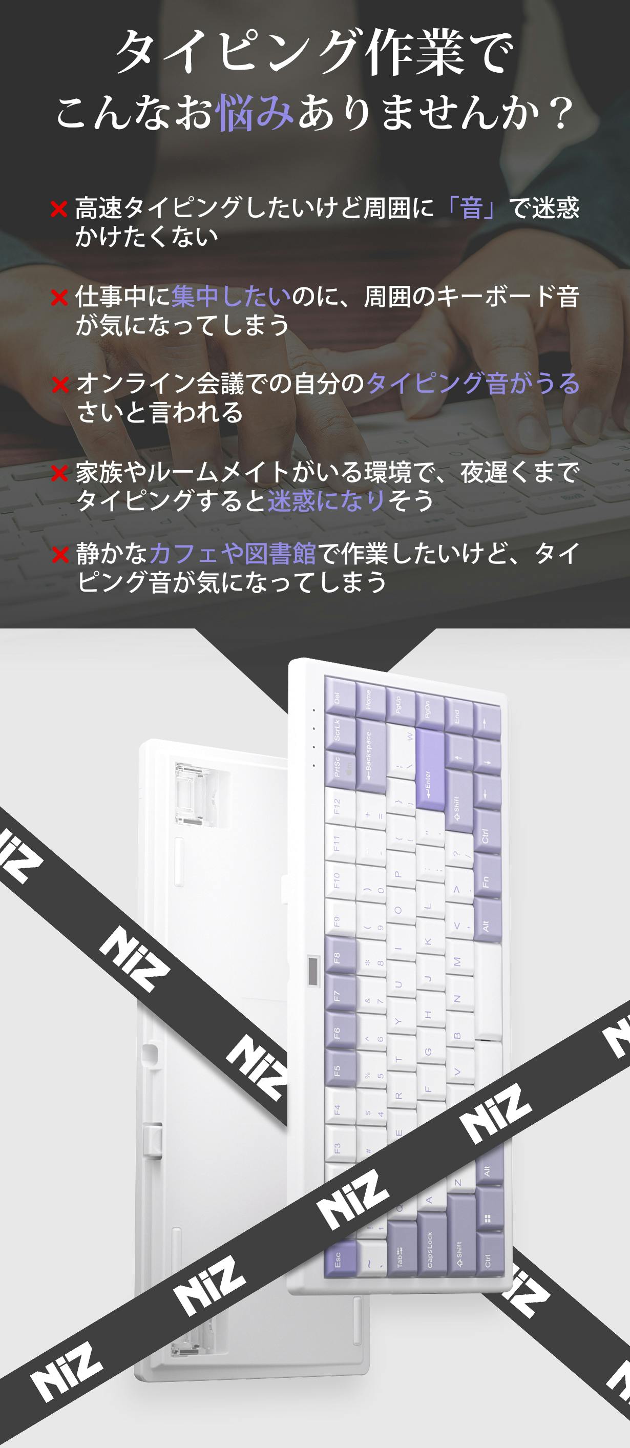 だからこそ、NIZは静電容量式無接点キーボードの分野で、さらなる低騒音を追求し続けているのです。各キーの下降・上昇には静寂が伴い、リラックスした静かな気分でタイピングを楽しみます。