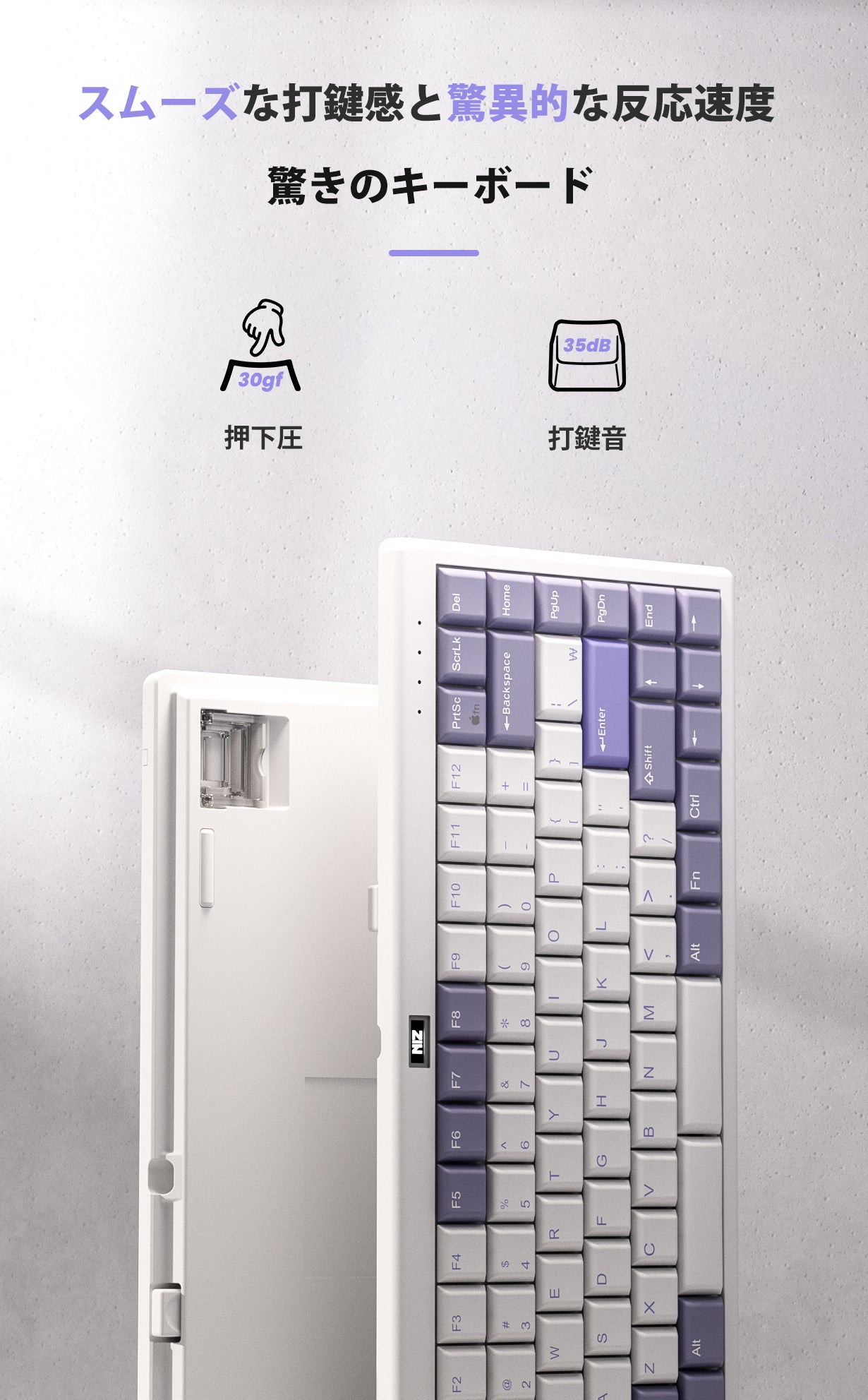静電容量無接点方式キーボード「L84」は、新しいスイッチを搭載し、押下圧30gf、打鍵音35dBで、静かなタイピング体験を提供します。